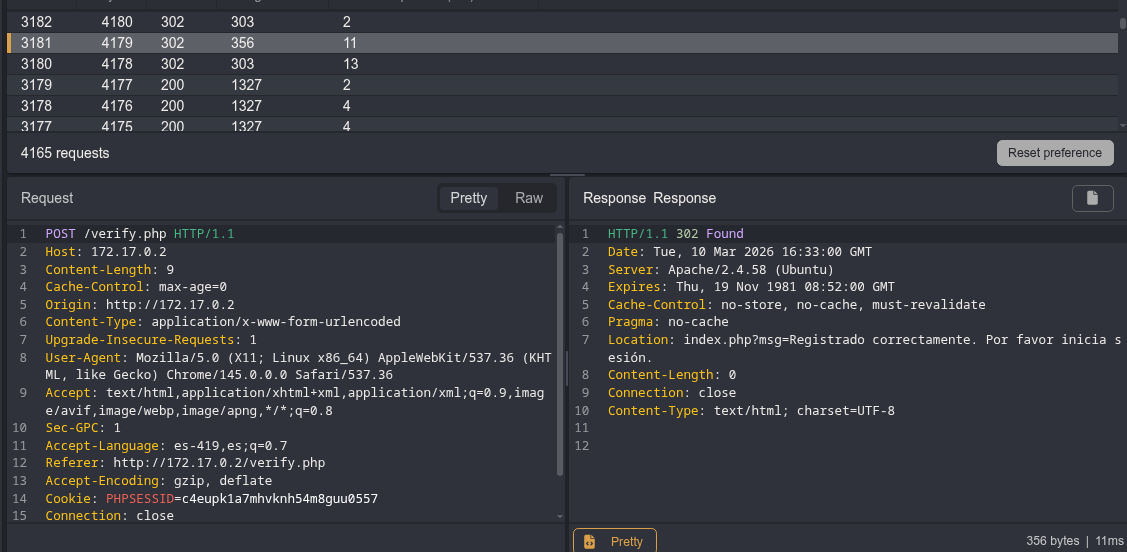 Como vemos en la primera capturta de abajo obtenemos un found pero cambia el content lenght señal de que acerto , no acabo de entender porque esta vez a cambiado el codigo de estado un pin antes del correcto en otras pruebas el primer found 302 era el correcto.
