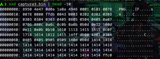 Ahora tratamos de buscar el IEND del png con el siguiente comando xxd captura3.bin | grep -i “49 45 4e 44” -A 5 -B 5 cosa que no aparece.Como estamos usando xdd que lo tranforma a hexadecimal y se sabe que el png tiene estructura definida por eso se usa el grep juntioa esos valores que se traducen a asci como IEND. Hasta ahora sabemos que el png no finaliza asi que pasamos a buscar el ultimo chunk conocido que es una unidad de datos estructurada.